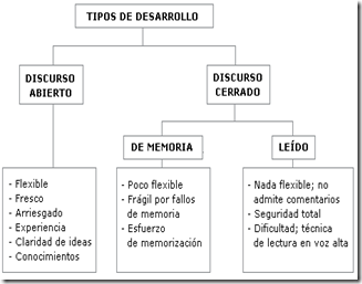 En cuanto a la cuestión de si un discurso debe ser pronunciado sin papeles o con ellos, e incluso, de si se puede leer o no, diremos que la lectura es totalmente lícita, siempre y cuando se lea bien en público. En cualquier caso, conviene utilizar al menos un guión como hilo conductor. El gráfico recoge los "pros" y "contras" de las tres posibilidades en el desarrollo de una exposición. Antes aclaremos que un discurso abierto es aquel que se va improvisando a medida que se habla; por el contrario, uno cerrado es el realizado de antemano.